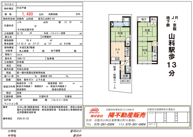 京都市山科区の落ち着いた住宅街に位置する3DKの戸建住宅。