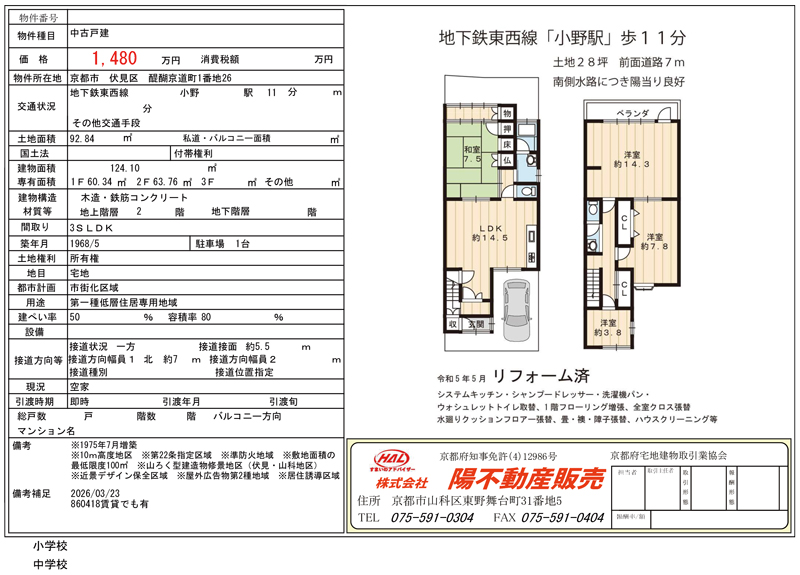 京都市伏見区醍醐京道町に位置する3SLDKの中古戸建です。土地約28坪、建物面積約124㎡とゆとりのある住まいで、ご家族それぞれの個室を確保しやすい間取りとなっています。納戸スペースもあり、収納としてはもちろん、テレワークスペースや趣味のお部屋としてもご活用いただけます。